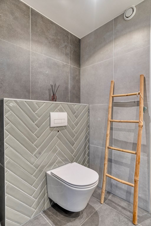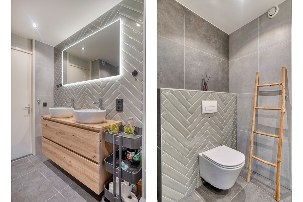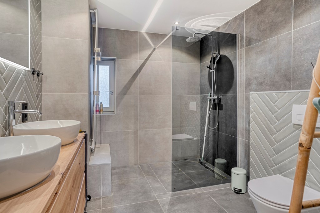 • In 2023 is de badkamer geheel gemoderniseerd. Hierbij is deze afgewerkt met een moderne lichte tegel en voorzien van een ruime inloopdouche, toilet en dubbele vaste wastafel welke geplaatst zijn op een badmeubel.