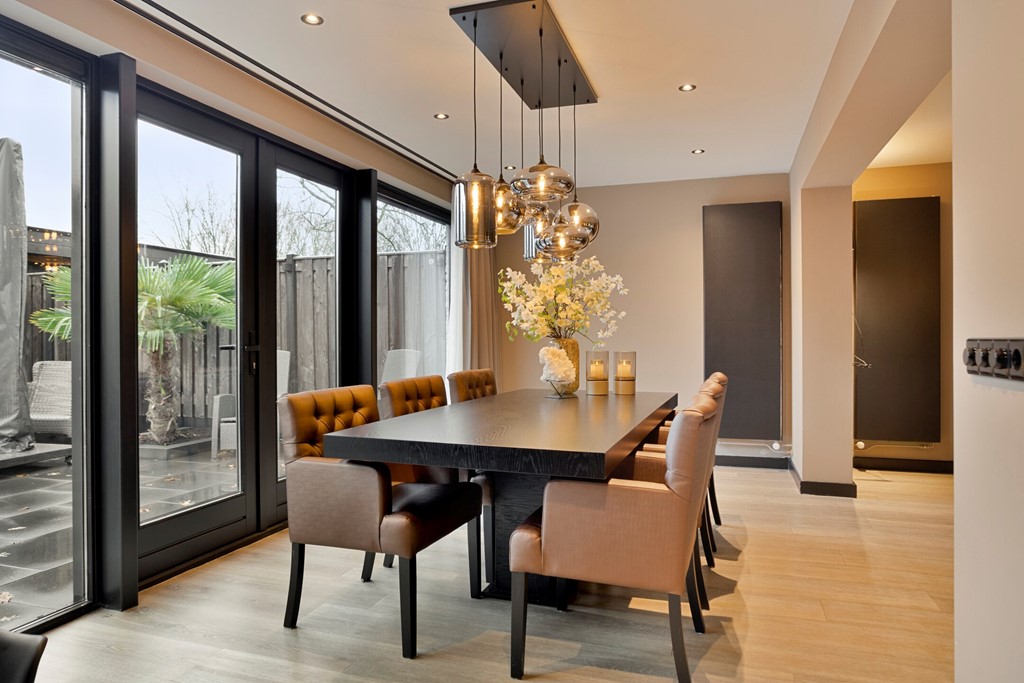 • De begane grond is uitgebouwd over de gehele breedte van de woning. Hierbij is een bestaande serre vervangen voor een geheel geïsoleerde uitbouw voorzien van een grote schuifpui welke toegang biedt tot het terras.