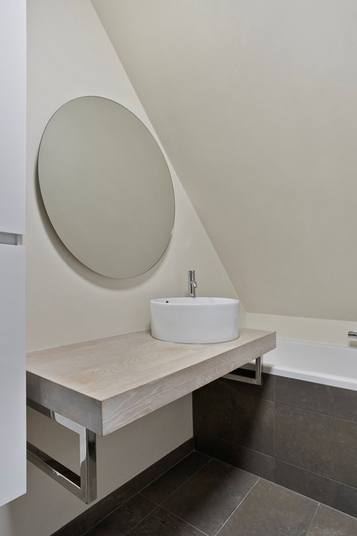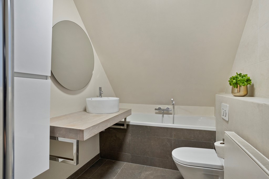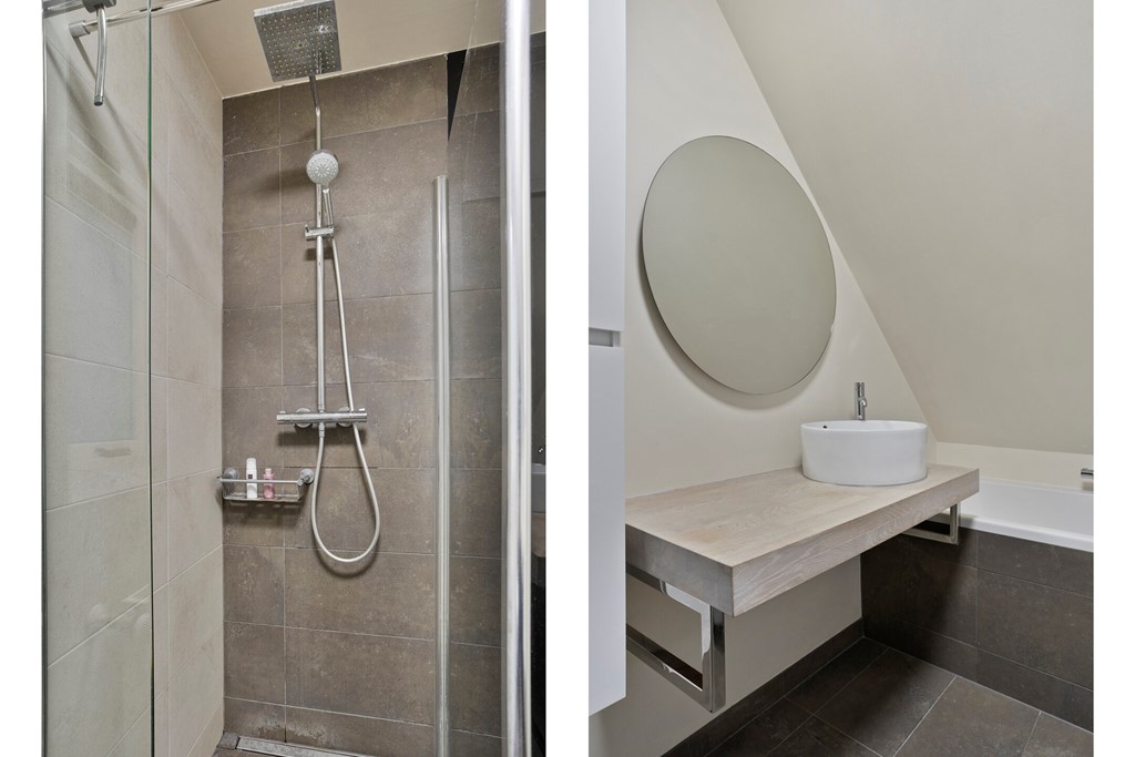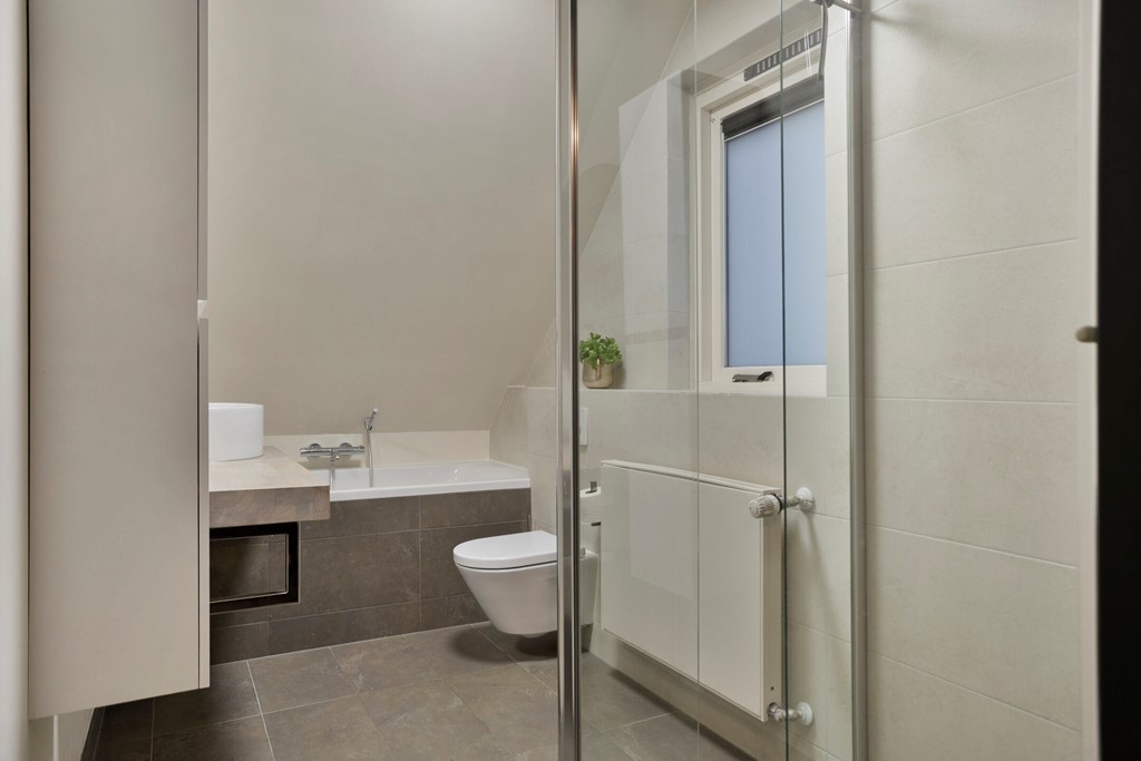 De strakke badkamer is uitgerust met een ligbad, inloopdouche, toilet en vaste wastafel.