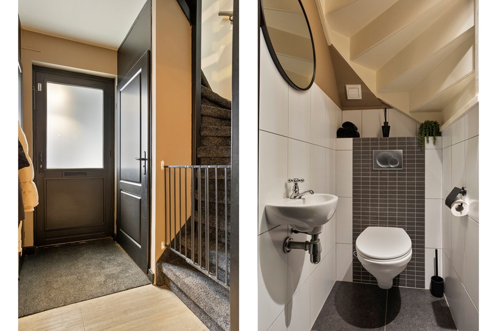 Aansluitend vind je de bijkeuken met witgoedaansluitingen en toegang tot de achtertuin. Vanuit hier heb je ook toegang tot de inpandige berging – ideaal voor extra opslagruimte, een hobbyruimte of om de fietsen veilig en droog te parkeren.
