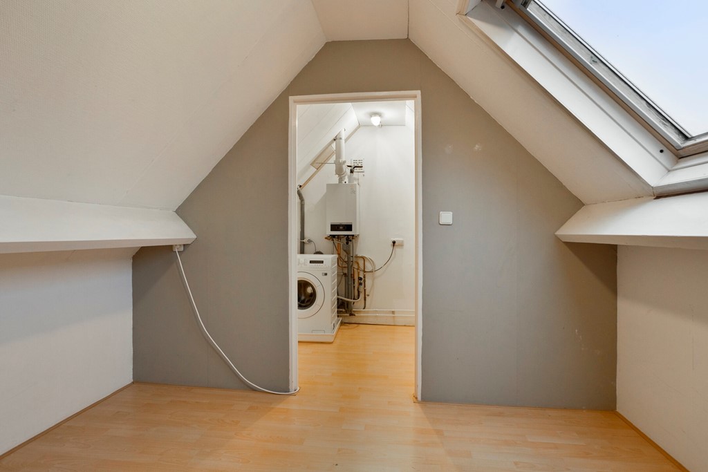 De tweede verdieping biedt een voorzolder waar nog een mogelijkheid aanwezig is om de witgoedaansluitingen te plaatsen en een lichte, vierde slaapkamer met vaste kastruimte: een fijne plek voor een logeerkamer of rustige werkplek.