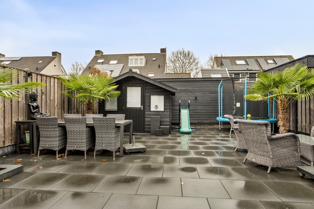 De verzorgde achtertuin beschikt over een tuinhuis (2022).